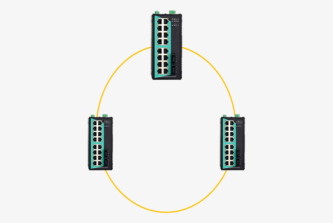 Se trata de la topología en anillo más básica, conformada por la interconexión de tres o más switches en un lazo cerrado mediante cables de fibra óptica. La transmisión de datos puede realizarse en ambas direcciones, lo que permite una rápida recuperación en caso de fallo en algún enlace. Es ampliamente utilizada en sistemas industriales de menor escala o como columna vertebral de una red zonal.