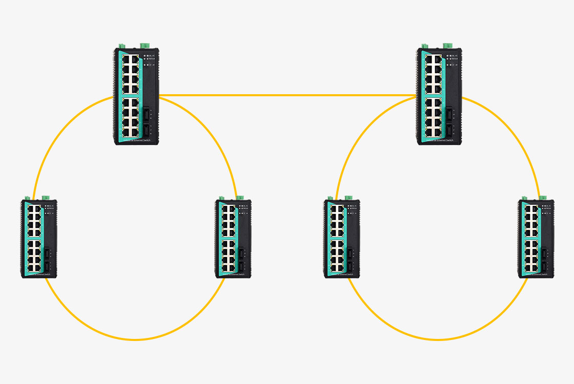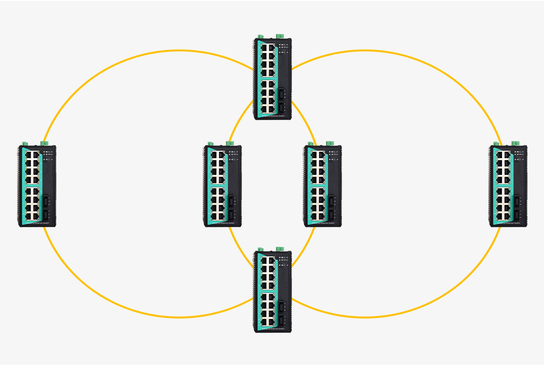 Múltiples anillos comparten dos o más conmutadores comunes, conformando una estructura mallada. Esta topología favorece redes de gran escala y alta disponibilidad, donde distintas áreas operativas requieren redundancia local y, simultáneamente, interconexión. Es comúnmente implementada en redes eléctricas, sistemas de transporte y complejos parques industriales.s.